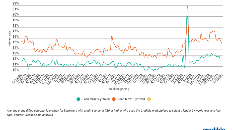 Personal loan interest rates fell over the last seven days for 5-year fixed-rate loans, while rates for 3-year loans rose. Rates for 3-year loans climbed 0.31 percentage points, while 5-year loans tumbled more than a quarter of a percentage point. In addition to this week's rate changes, interest rates for both loan terms remain higher than they were this time last year. Still, borrowers can take advantage of interest savings with a 5-year personal loan right now. Both loan terms offer interest rates that are much lower than higher-cost borrowing options such as credit cards.